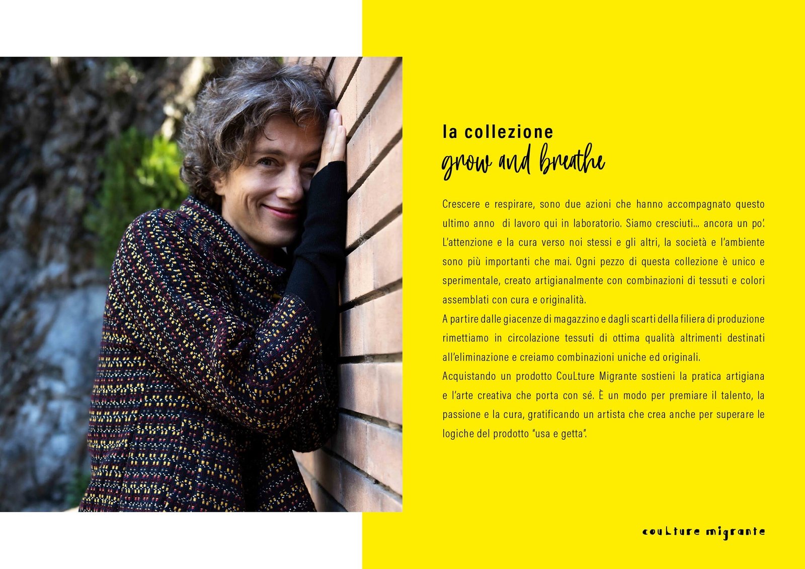 Crescere e respirare, sono due azioni che hanno accompagnato questo ultimo anno di lavoro qui in laboratorio. Siamo cresciuti… ancora un po’. L’attenzione e la cura verso noi stessi e gli altri, la società e l’ambiente sono più importanti che mai. Ogni pezzo di questa collezione è unico e sperimentale, creato artigianalmente con combinazioni di tessuti e colori assemblati con cura e originalità.
