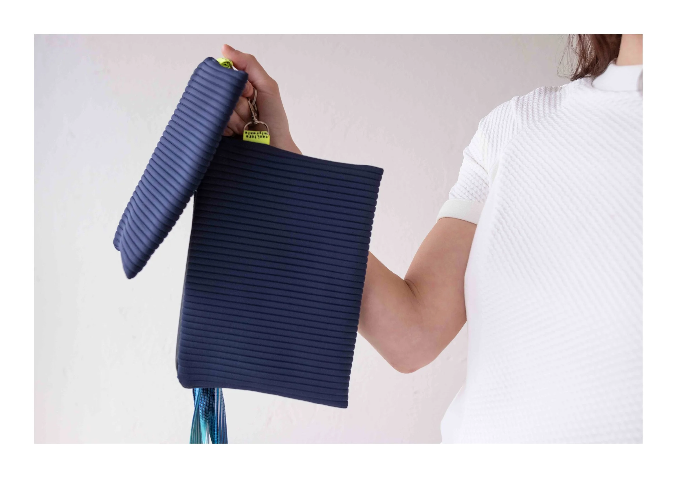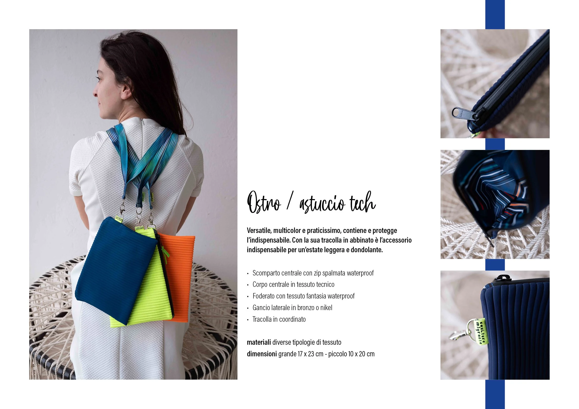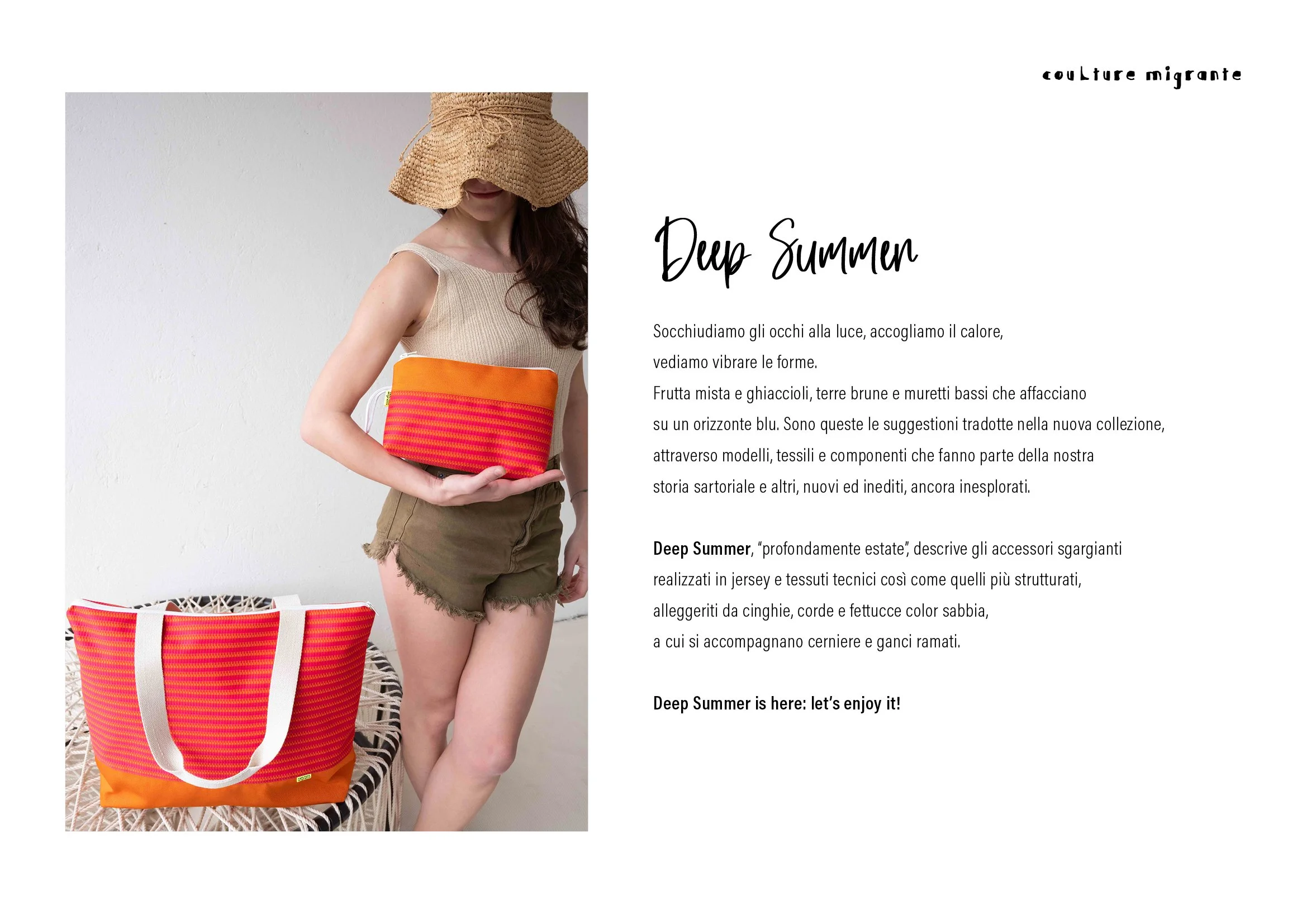 deep summer, “profondamente estate”, descrive gli accessori sgargianti realizzati in jersey e tessuti tecnici così come quelli più strutturati, alleggeriti da cinghie, corde e fettucce color sabbia, a cui si accompagnano cerniere e ganci ramati.